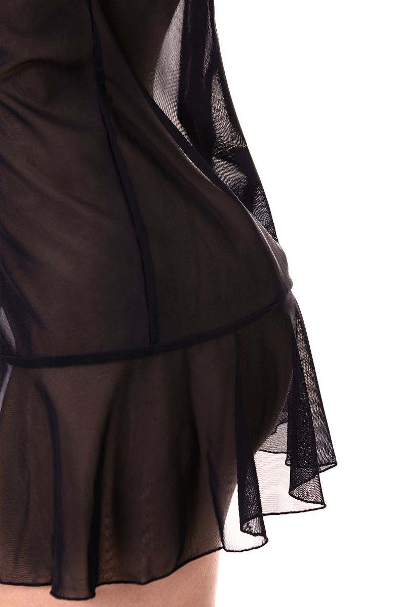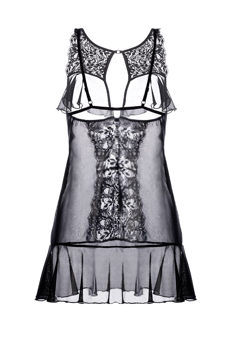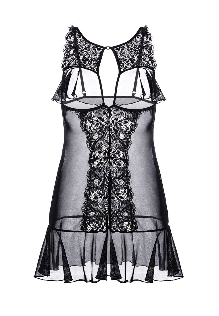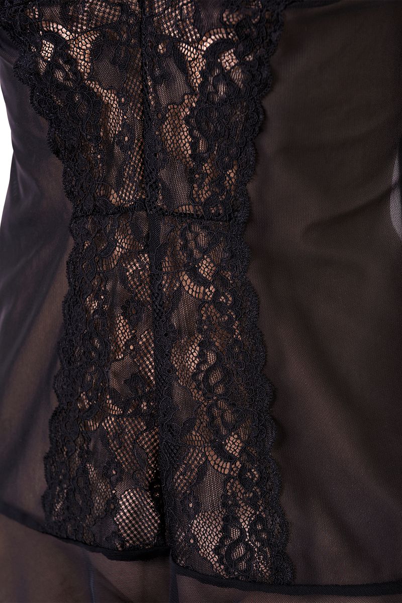 Комбинация из эластичной сетки со вставками кружева. Открытый бюст и подол декорированы мягкими оборками. Регулируемые бретели. Допускается замена кружева на аналогичное.