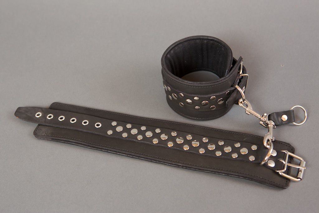 Наручи узкие (черные). Наручники с фиксирующим ремнем на подкладке. Подкладка: синтетическая пена обтянутая мягкой кожей. Дополнительно прилагается карабин. Ручная работа. Ширина – 5 см.