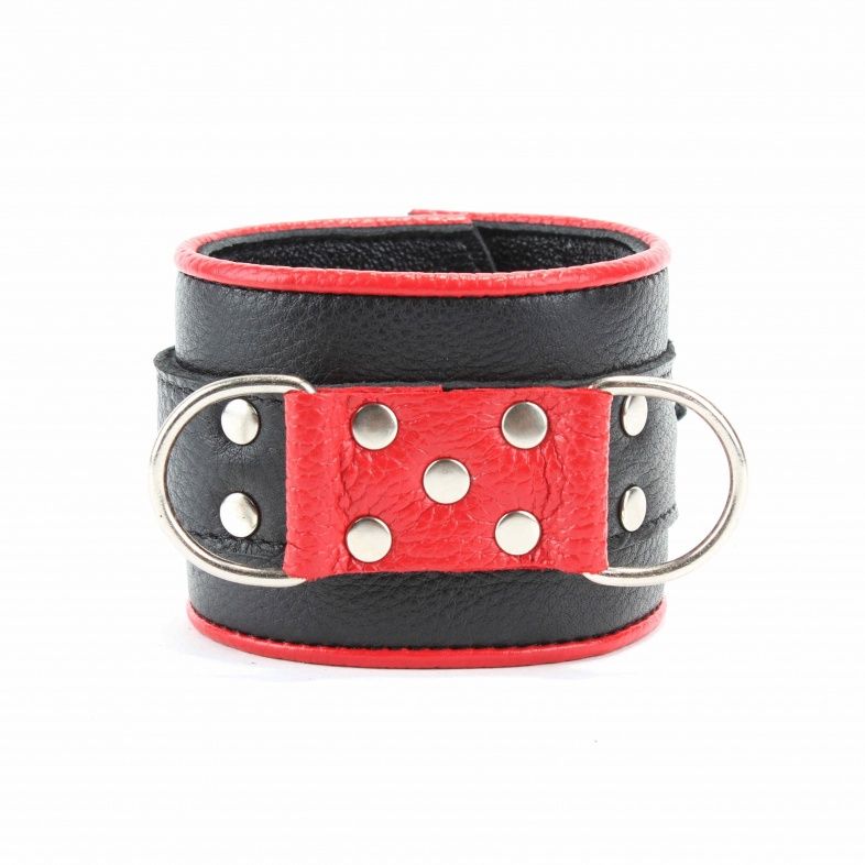 Сильные наручники в красно-черном цвете. Украшены заклепками и соединяются между собой цепью с карабинами. Размер наручников регулируется при помощи застежки. Ширина - 6 см. Длина цепочки - 13 см.