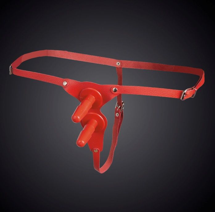 Страпон для двойного проникновения. В комплект входят два съёмных пластиковых плага для насадок. Изготовлен из натуральной кожи и никелированной фурнитуры. Размер универсальный.