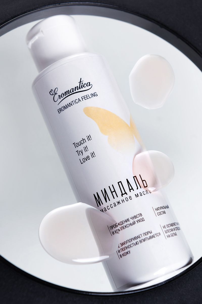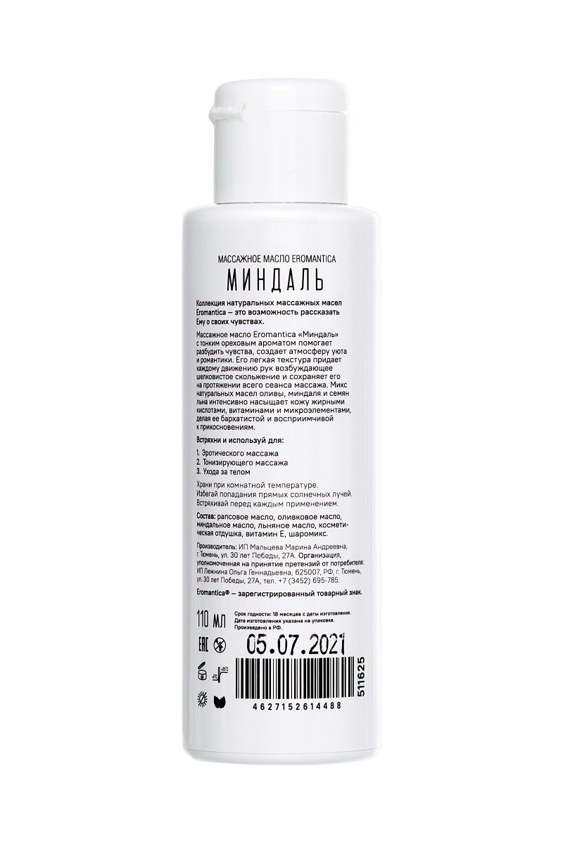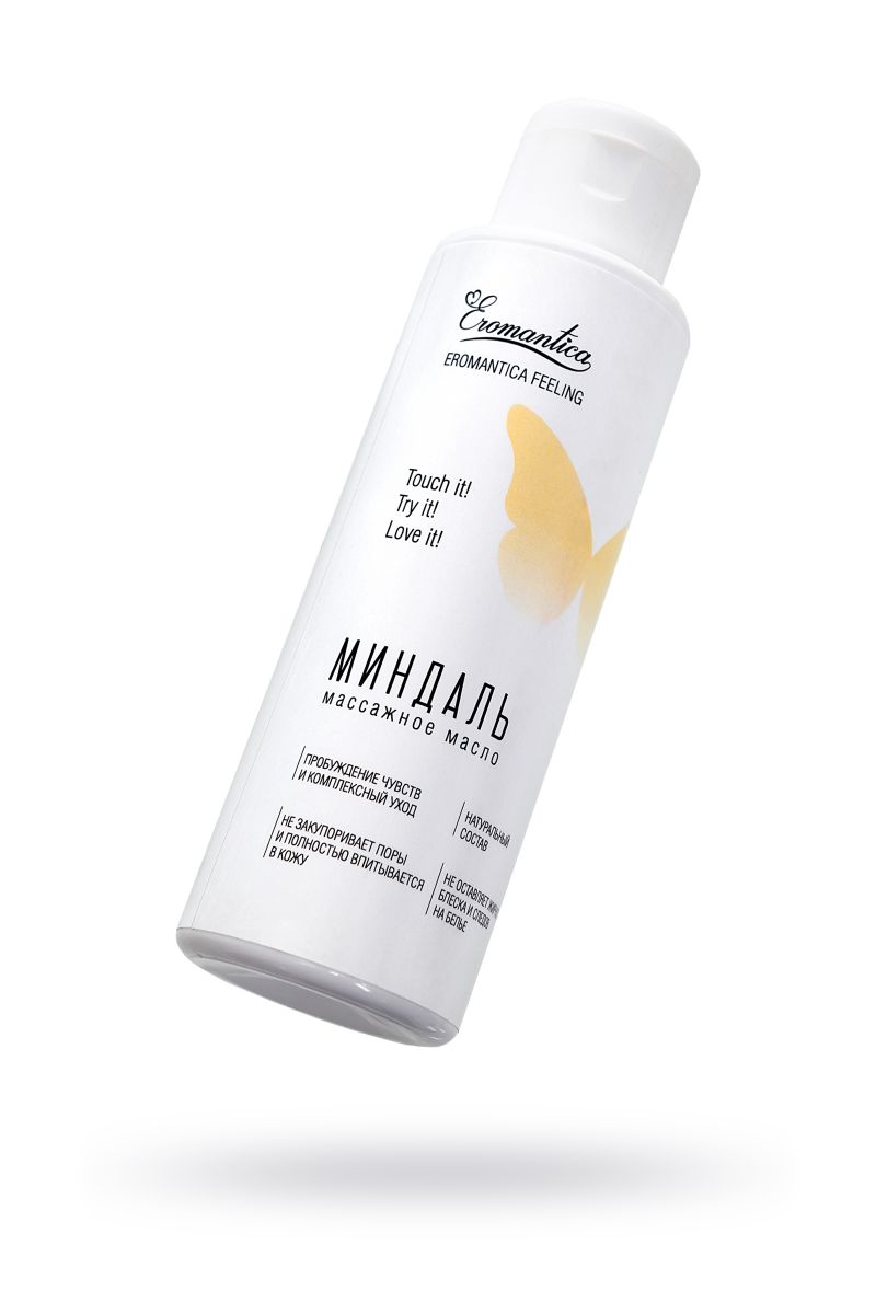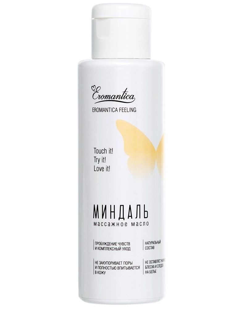 Коллекция натуральных массажных масел Eromantica — это возможность рассказать Ему о своих чувствах. Массажное масло Eromantica «Миндаль» с тонким ореховым ароматом помогает разбудить чувства и создает атмосферу уюта и романтики. Его легкая текстура придает каждому движению рук возбуждающее шелковистое скольжение и сохраняет его на протяжении всего сеанса массажа. Микс натуральных масел оливы, миндаля и семян льна интенсивно насыщает кожу жирными кислотами, витаминами и микроэлементами, делая ее бархатистой и восприимчивой к прикосновениям. Встряхни и используй для: - Эротического массажа: согрей масло в ладонях и распредели его по телу партнера плавными массажными движениями. Особое внимание уделяй эрогенным зонам. - Тонизирующего массажа: нанеси масло на нужный участок тела и разогрей кожу интенсивными движениями. Затем проработай мышцы, сжимая их пальцами рук. - Ухода за телом: нанеси сразу после душа на влажную кожу и равномерно распредели по телу. Храни при комнатной температуре. Избегай попадания прямых солнечных лучей. Встряхивай перед каждым применением.