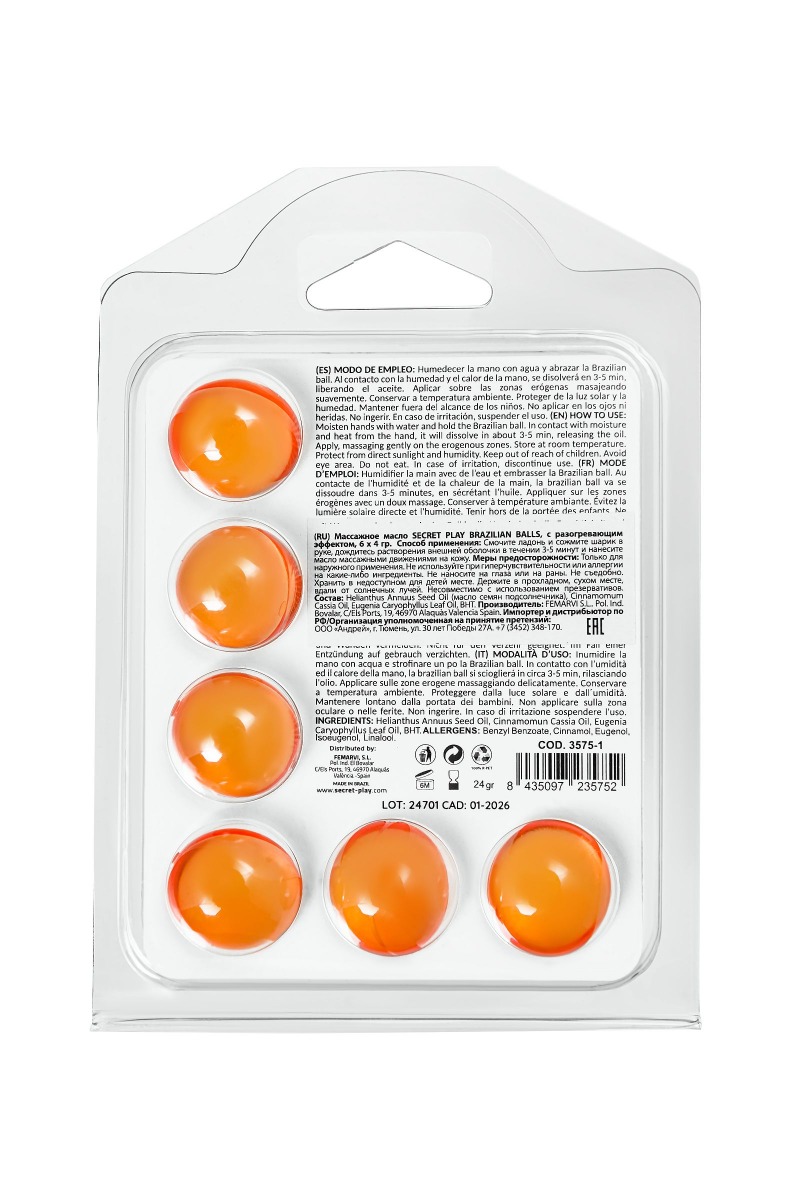 Бразильские шарики с горячим эффектом — это новый уровень удовольствия и страсти в интимных моментах. Эти массажные шарики от Secret Play подарят вам невероятное тепло, усиливающее чувственность и возбуждение, создавая атмосферу настоящего эротизма. Превратите прелюдию в незабываемое приключение с шариками, которые мгновенно привносят в игру ощущение тепла и усиливают каждое прикосновение. Использовать их просто: смочите руку водой и обнимите ладонью шарик, позволяя теплу и влажности ваших рук заставить его раствориться за 3–5 минут. Как только шарик тает, он превращается в нежное массажное масло с разогревающим эффектом, которое идеально подходит для массажа и эротических ласк. Это масло не только усиливает ощущения, но и создает атмосферу страсти и близости. Откройте для себя бразильские шарики с горячим эффектом и наслаждайтесь чувственными, согревающими прикосновениями, которые добавят страсти в ваши романтические моменты!