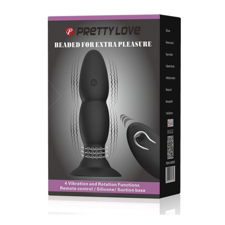 Анальная пробка с вибрацией, ротацией у основания и дистанционным управлением. 4 функции вибрации. 4 режима ротации встроенных в основание бусинок. Основание-присоска. Перезаряжаемая. Пульт работает от 1 батарейки типа ААА (нет в комплекте).